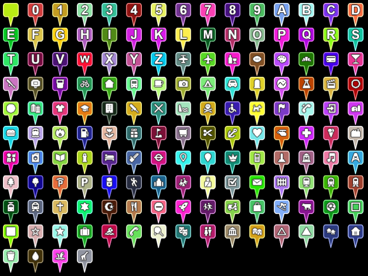 使用 Maki 图标集生成的示例针,该图集载有 NT 0 ,以及单字符文本.